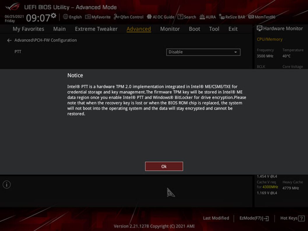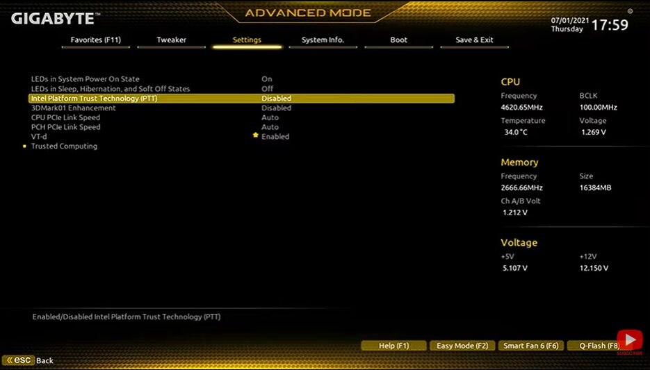 for Intel CPU: enable “Intel Platform Trust Technology (PTT)“